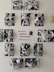 Dans le cadre du projet en arts visuels autour de l’art en 3D, les élèves de CP-CE1 ont étudié des œuvres de Charles McGee (artiste américain). Puis ils se sont inspirés des différents graphismes pour réaliser leurs productions en relief avec des bandes de papier.